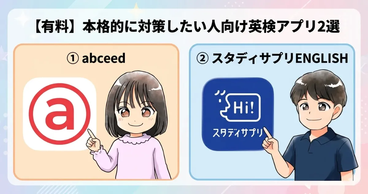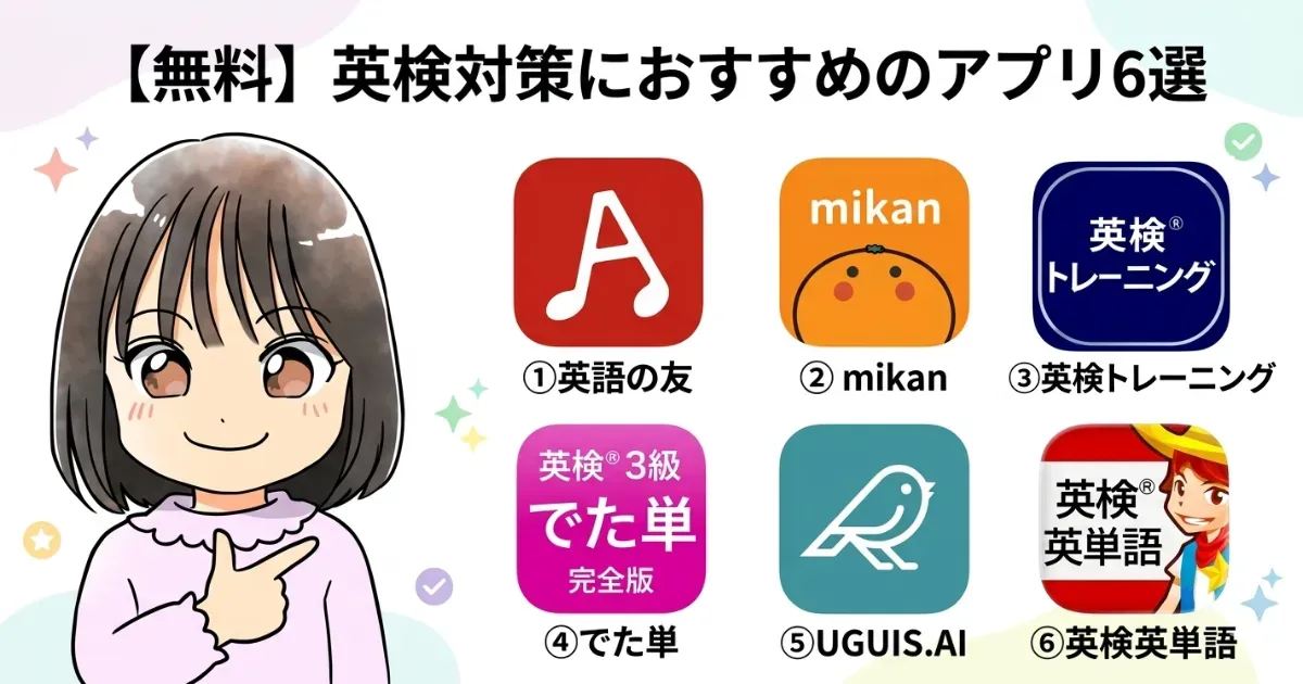 3級以上は「英語の友」「mikan」「英検トレーニング」などのアプリがおすすめ。