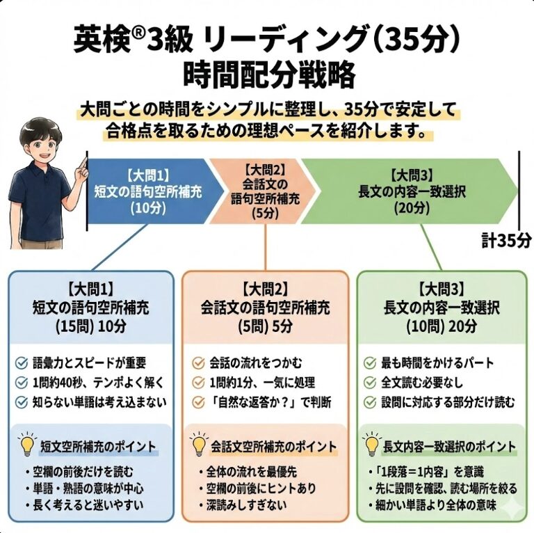 この記事では、英検3級で安定して合格点を取るための時間配分と、各パートの進め方を簡潔にまとめました。
