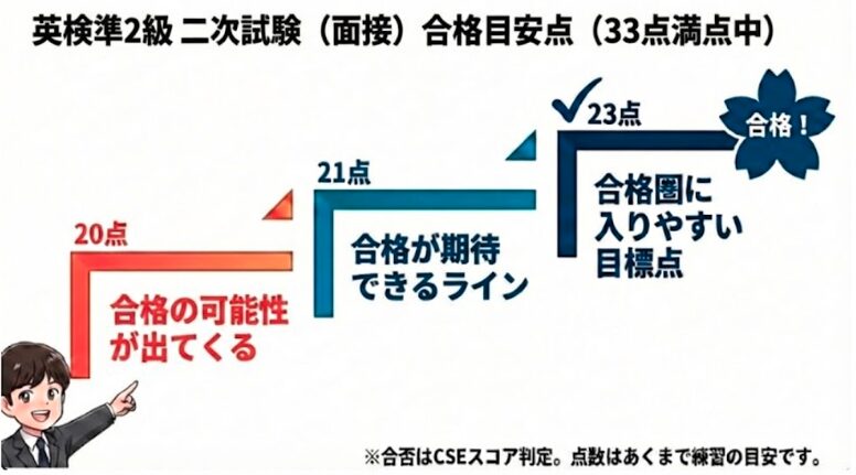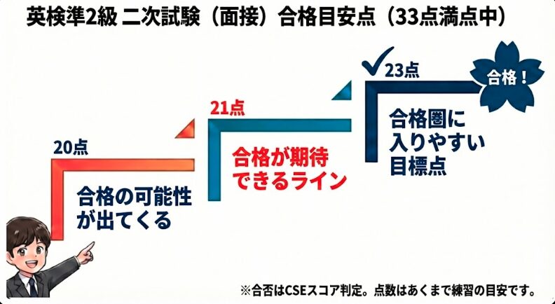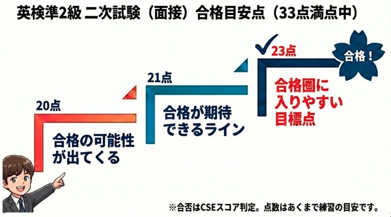 目安としては、33点満点で21〜23点を狙うのが分かりやすいです。
