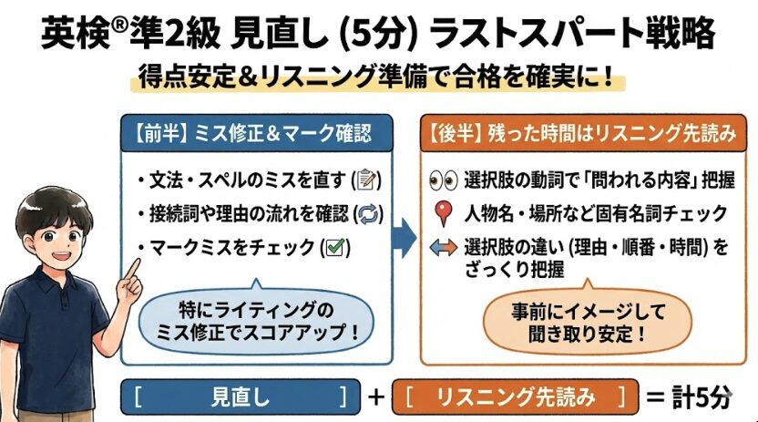 | 見直し(5分) | 全体 | マークミス/文法・スペル確認/リスニング先読み | — | 5分 |